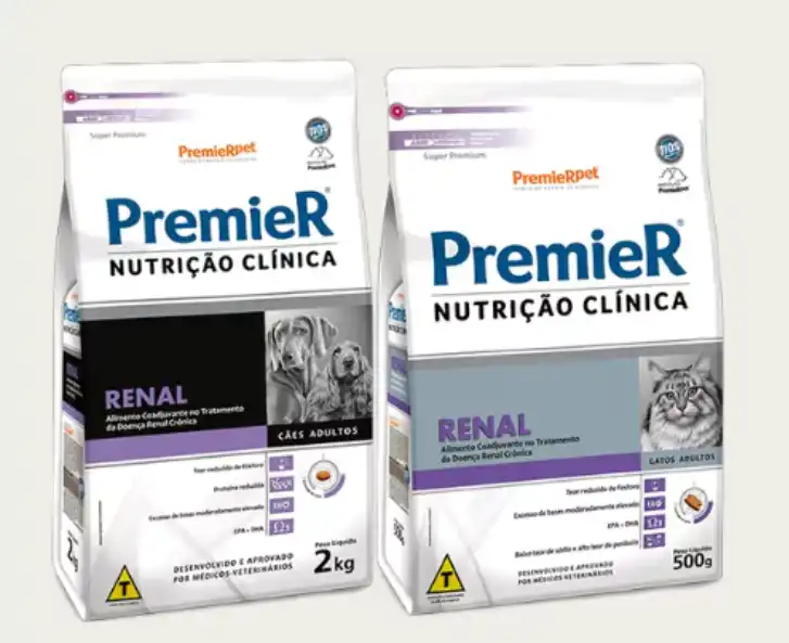 PremieR® Nutrição Clínica Renal Cães Adultos Porte Pequeno, PremieR® Nutrição Clínica Renal Cães Adultos Porte Médio e Grande e PremieR® Nutrição Clínica Renal Gatos são alimentos coadjuvantes indicados para o manejo da doença renal crônica em cães e gatos adultos.