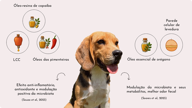 Figura 1. Óleos funcionais avaliados nos estudos de Souza et al. (2023) e Soares et al. (2023), associados a efeitos positivos na microbiota e na modulação inflamatória e oxidativa em cães.